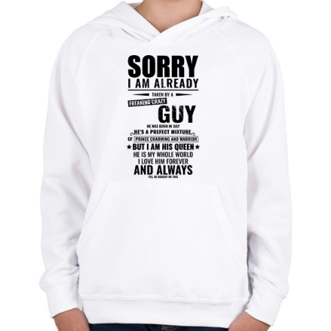 1 kép PRINTFASHION Bocsi, foglalt vagyok - Július - Gyerek kapucnis pulóver - Fehér