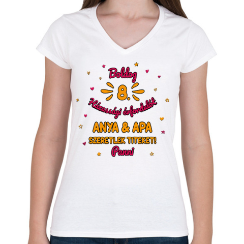 1 kép PRINTFASHION Boldog évfordulót - névvel - Női V-nyakú póló - Fehér