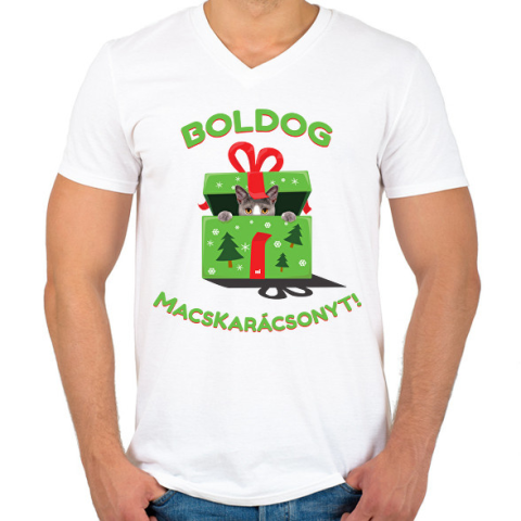 1 kép PRINTFASHION Cicát mindenkinek! Karácsonyi - Férfi V-nyakú póló - Fehér