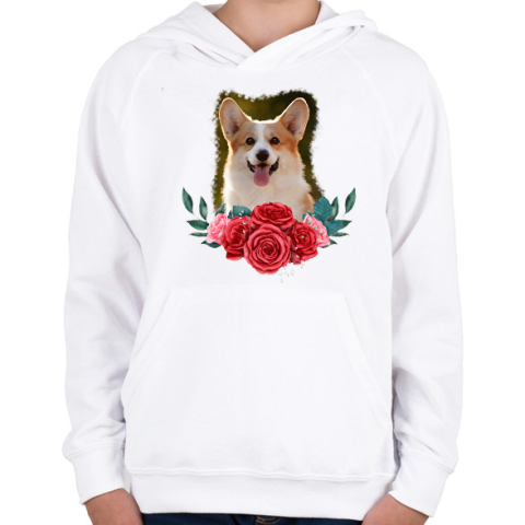 1 kép PRINTFASHION Corgi virággal - Gyerek kapucnis pulóver - Fehér