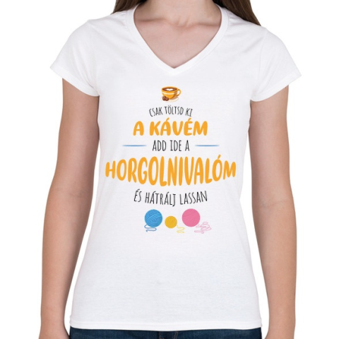 1 kép PRINTFASHION Csak töltsd ki a kávém - Horgolós - Női V-nyakú póló - Fehér