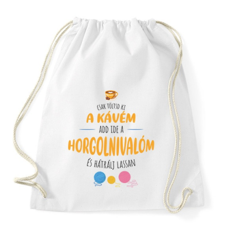 1 kép PRINTFASHION Csak töltsd ki a kávém - Horgolós - Sportzsák, Tornazsák - Fehér