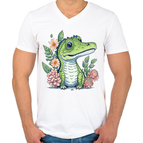 1 kép PRINTFASHION Cuki krokodil virágokkal - Férfi V-nyakú póló - Fehér