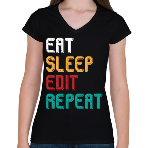 1 kép PRINTFASHION Eat, sleep, edit, repeat színes - Női V-nyakú póló - Fekete