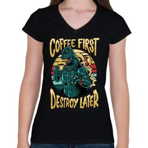 1 kép PRINTFASHION Előbb kávé, aztán pusztítás - Női V-nyakú póló - Fekete