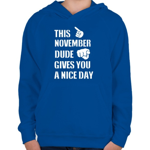 1 kép PRINTFASHION Ez a novemberi csávó szép napot kíván neked - Gyerek kapucnis pulóver - Királykék