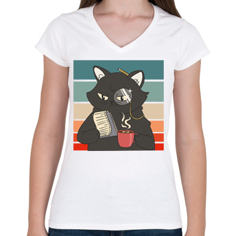 1 kép PRINTFASHION Fekete macska - Női V-nyakú póló - Fehér