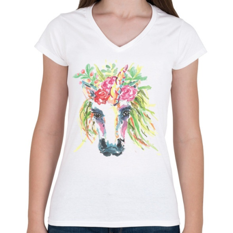 1 kép PRINTFASHION Festett egyszarvú virágokkal - Női V-nyakú póló - Fehér