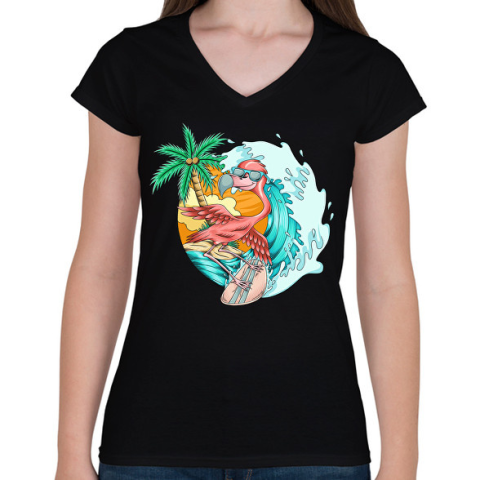 1 kép PRINTFASHION flamingo - Női V-nyakú póló - Fekete