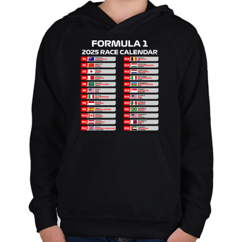 1 kép PRINTFASHION Forma 1 2025 versenynaptár - Gyerek kapucnis pulóver - Fekete
