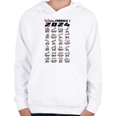 1 kép PRINTFASHION Formula 1 - 2024 versenynaptár (fekete) - Gyerek kapucnis pulóver - Fehér