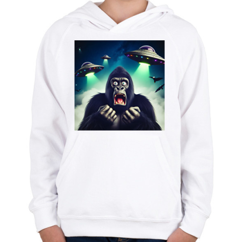 1 kép PRINTFASHION Fura cuki ijedt gorilla - Retro UFÓ invázió - Gyerek kapucnis pulóver - Fehér