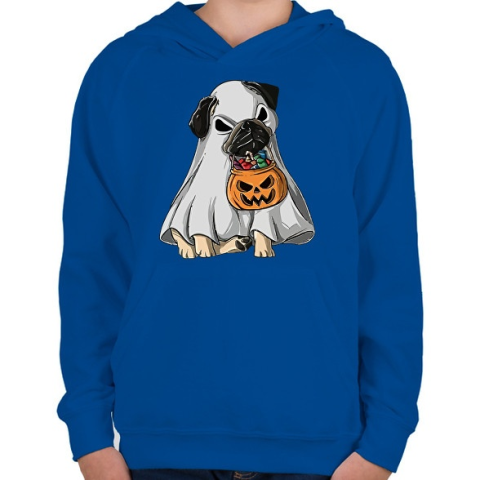 1 kép PRINTFASHION Halloween mops - Gyerek kapucnis pulóver - Királykék