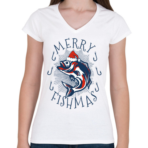1 kép PRINTFASHION Horgász karácsony - Női V-nyakú póló - Fehér