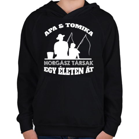 1 kép PRINTFASHION Horgász társ - Apa és fia névvel - Gyerek kapucnis pulóver - Fekete