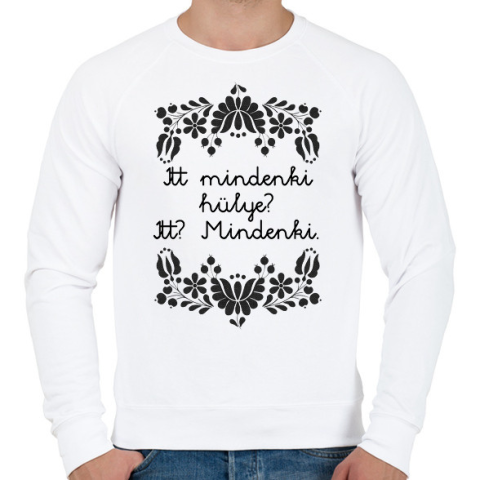 1 kép PRINTFASHION Itt mindenki hülye? Itt? Mindenki. - Férfi pulóver - Fehér