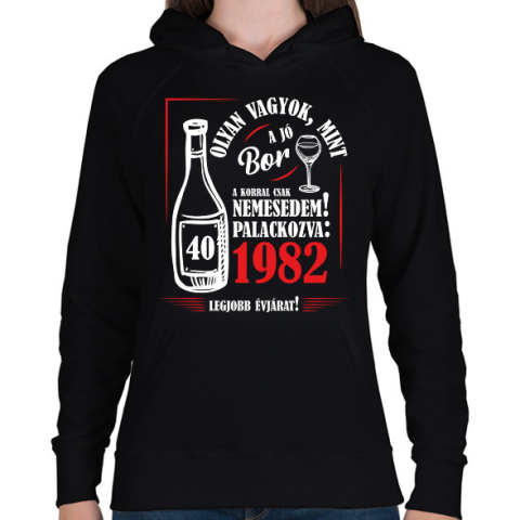 1 kép PRINTFASHION Jó bor palackozva - Évszámmal (fehér) - Női kapucnis pulóver - Fekete