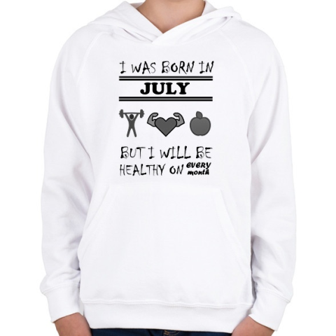 1 kép PRINTFASHION Júliusban születtem de minden hónapban egészségesen élek - Gyerek kapucnis pulóver - Fehér