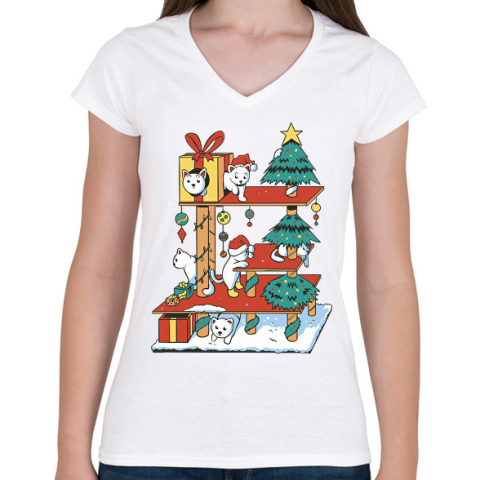 1 kép PRINTFASHION Karácsonyi cica ház - Női V-nyakú póló - Fehér