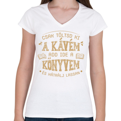 1 kép PRINTFASHION Kávé, könyv, hátrálj - Női V-nyakú póló - Fehér