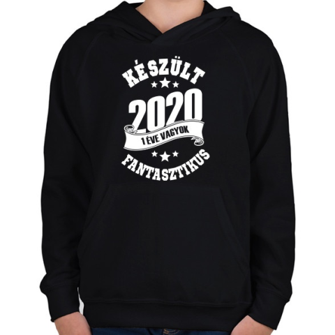 1 kép PRINTFASHION Készült 2020 - 1 éve vagyok fantasztikus - Gyerek kapucnis pulóver - Fekete