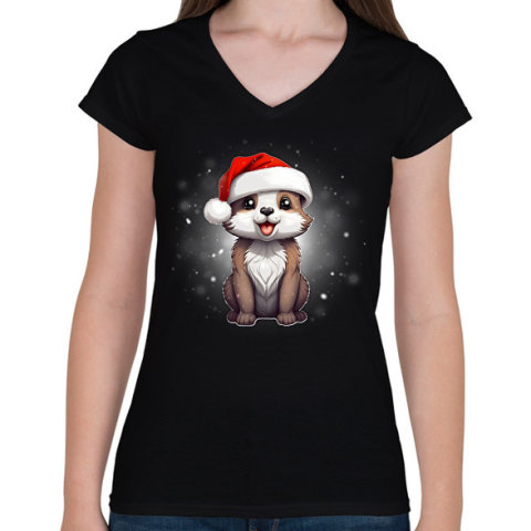 1 kép PRINTFASHION kiskutya a hóban - Női V-nyakú póló - Fekete