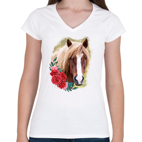 1 kép PRINTFASHION Ló virággal - Női V-nyakú póló - Fehér