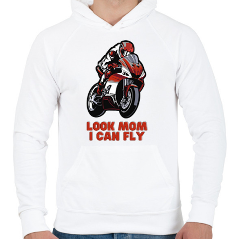 1 kép PRINTFASHION Look Mom, I can fly motoros - Férfi kapucnis pulóver - Fehér