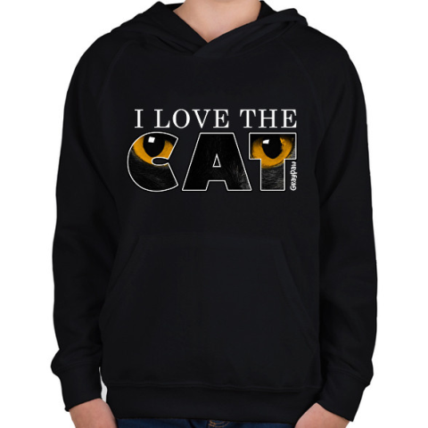 1 kép PRINTFASHION Macska sárga szemekkel sötét színű termékekre - Gyerek kapucnis pulóver - Fekete