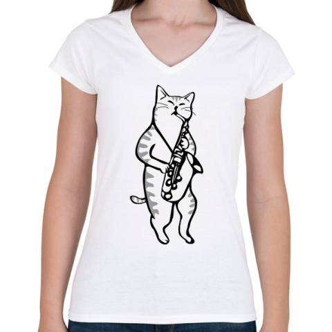 1 kép PRINTFASHION Macska szaxofonozik - Női V-nyakú póló - Fehér