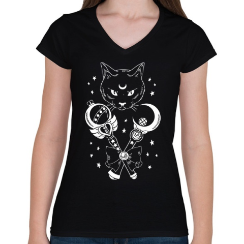1 kép PRINTFASHION Magic Cat - Női V-nyakú póló - Fekete