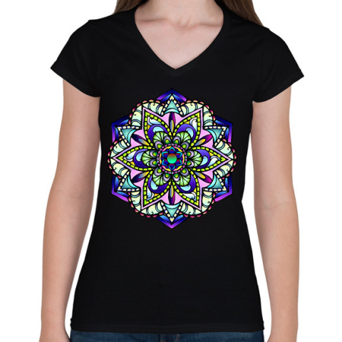 1 kép PRINTFASHION mandalas - Női V-nyakú póló - Fekete