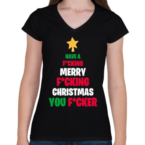 1 kép PRINTFASHION Merry Fcking Christmas Tree - Női V-nyakú póló - Fekete