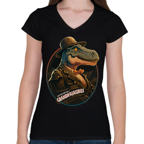 1 kép PRINTFASHION Nagypapaszaurusz T-REX Grandpasaurus - Női V-nyakú póló - Fekete