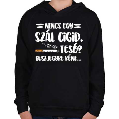 1 kép PRINTFASHION Nincs egy szál cigid, Tesó? Buszjegyre kéne... - Gyerek kapucnis pulóver - Fekete