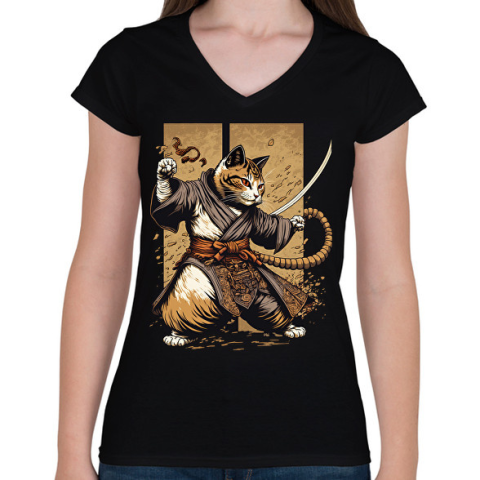 1 kép PRINTFASHION Ninja macska - Női V-nyakú póló - Fekete