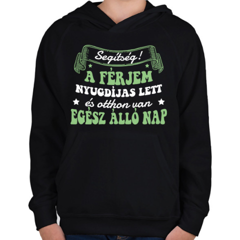1 kép PRINTFASHION Nyugdíjas férjem van - Gyerek kapucnis pulóver - Fekete