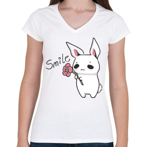 1 kép PRINTFASHION Nyuszi Virággal - Mosolyogj - Női V-nyakú póló - Fehér
