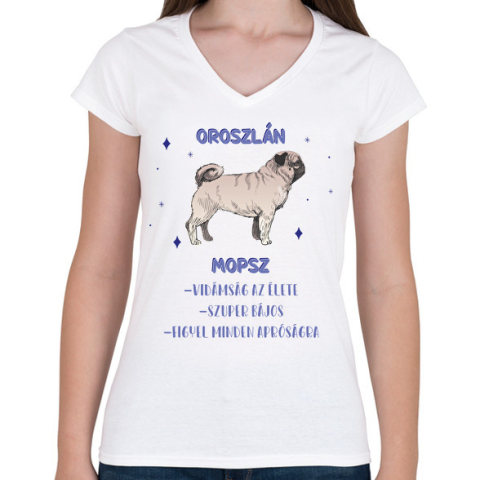 1 kép PRINTFASHION Oroszlán - Mopsz - Női V-nyakú póló - Fehér
