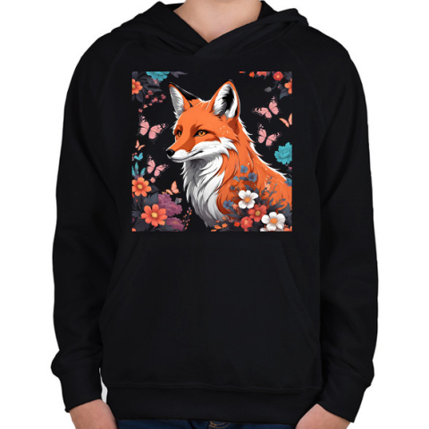 1 kép PRINTFASHION róka pillangókkal és virágokkal - Gyerek kapucnis pulóver - Fekete