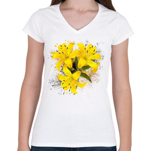 1 kép PRINTFASHION sárga lilom - Női V-nyakú póló - Fehér