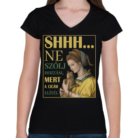 1 kép PRINTFASHION Shhh... ne szólj hozzám - Cicás - Női V-nyakú póló - Fekete