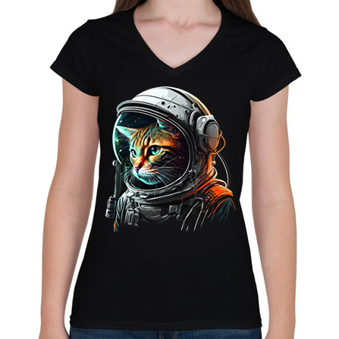 1 kép PRINTFASHION Space Cat - Női V-nyakú póló - Fekete