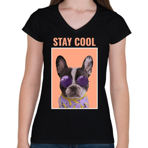 1 kép PRINTFASHION Stay Cool Frenchie - Női V-nyakú póló - Fekete