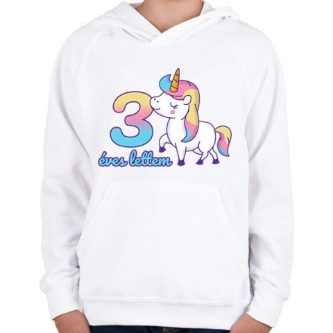 1 kép PRINTFASHION Unikornis: 3 éves lettem - Gyerek kapucnis pulóver - Fehér