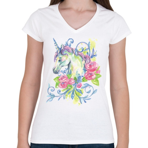 1 kép PRINTFASHION Unikornis virágokkal vízfesték - Női V-nyakú póló - Fehér