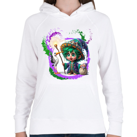 1 kép PRINTFASHION Varázslófiú gólyával és kisbabával - Női kapucnis pulóver - Fehér