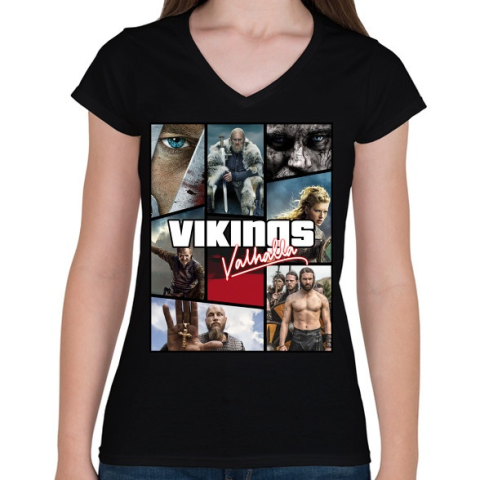 1 kép PRINTFASHION Vikingek - Női V-nyakú póló - Fekete
