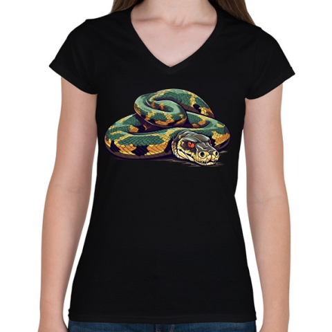 1 kép PRINTFASHION Zöld anakonda - Női V-nyakú póló - Fekete