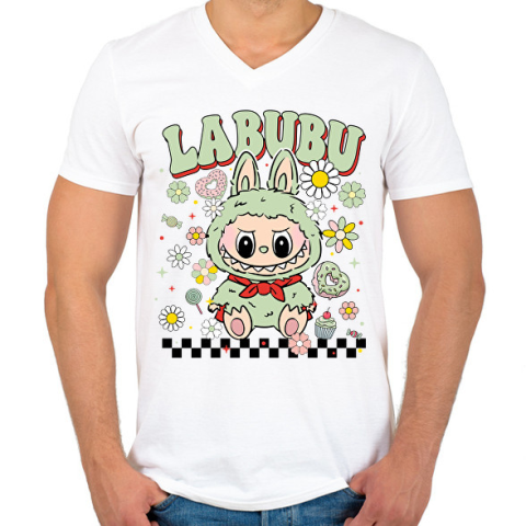 1 kép PRINTFASHION Zöld Labubu - Férfi V-nyakú póló - Fehér
